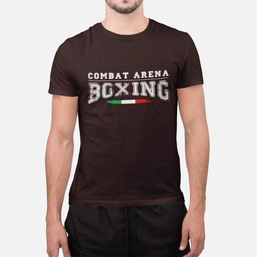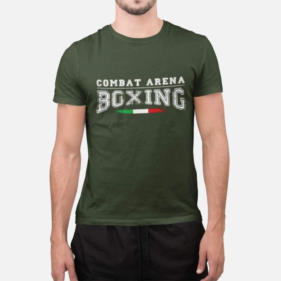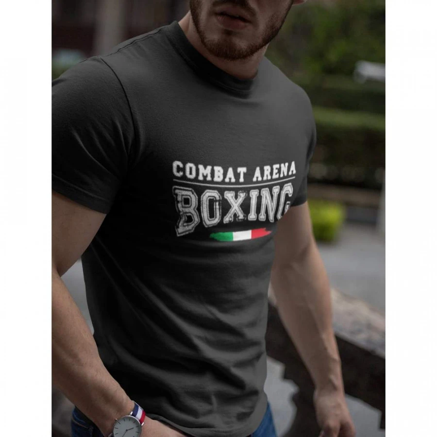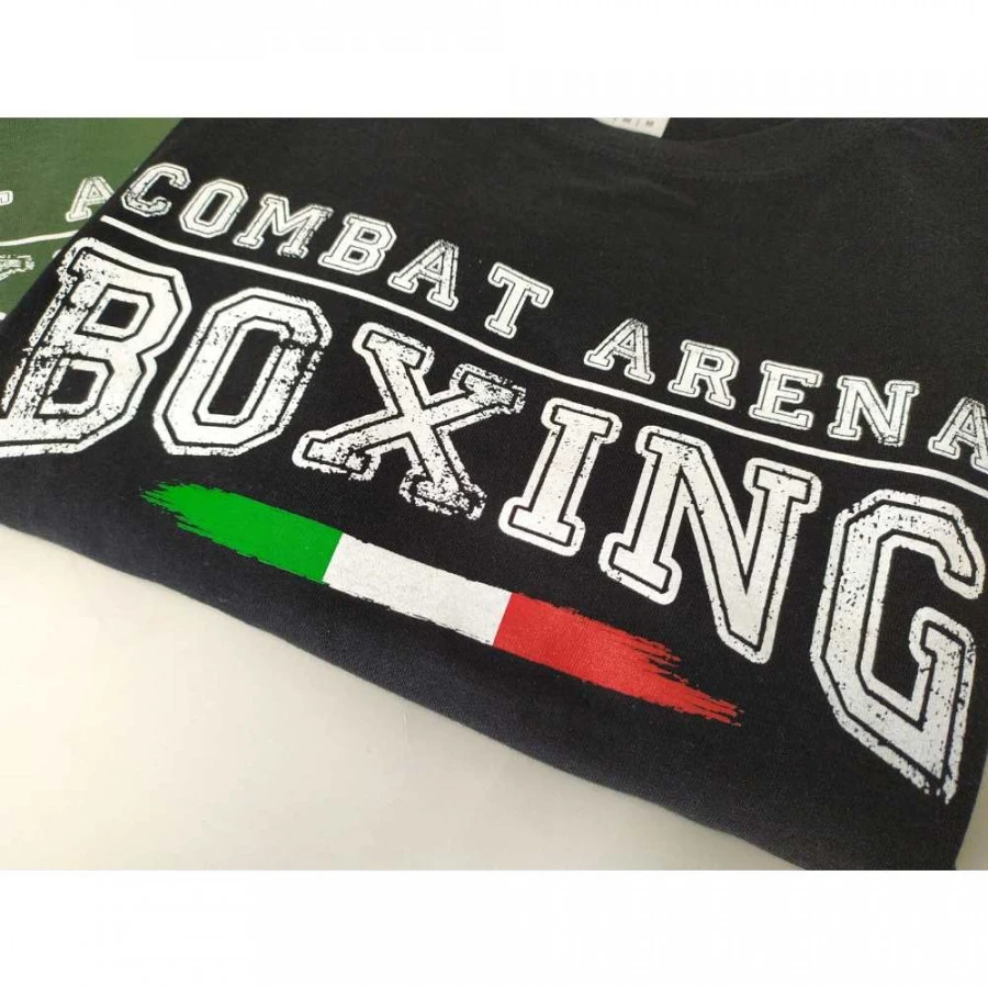 Sfoggia la T-shirt Combat Arena Boxing nel tempo libero e durante l`allenamento per un look al 100% da fighter. Realizzata in cotone morbido, questa maglietta si distingue per un design accattivante che richiama lo stile “old school”. Sul petto è presente la scritta con effetto vintage “Boxing”, che esprime tutta la tua passione per gli sport da combattimento: la Boxe come stile di vita, con i suoi valori, la voglia di vincere, la tecnica; la Boxe con una grande storia alle spalle, fatta di emozioni tra le sedici corde, di ardore, coraggio, rabbia, grinta e rispetto. Le grafiche della maglietta sono disegnate in Italia, come sottolinea il tricolore presente sotto alla scritta.