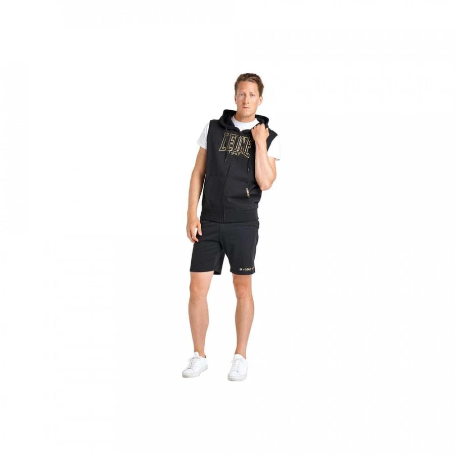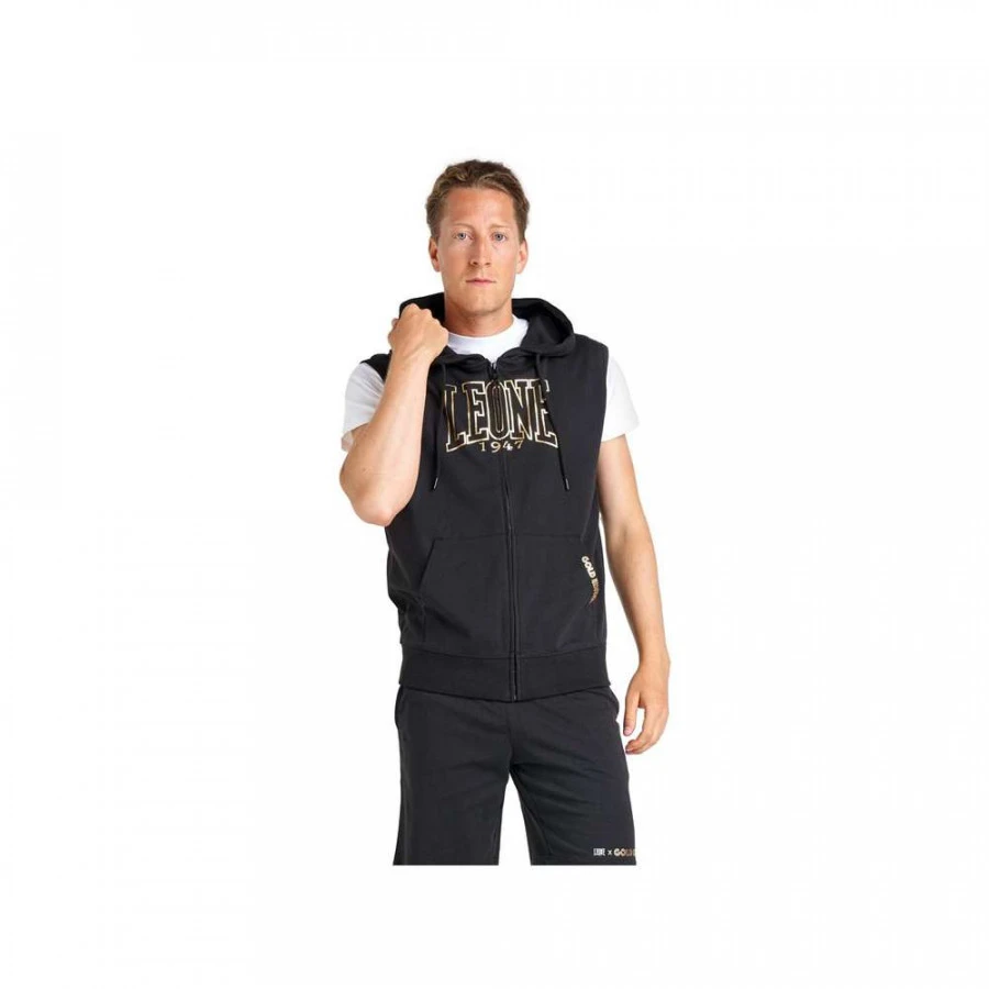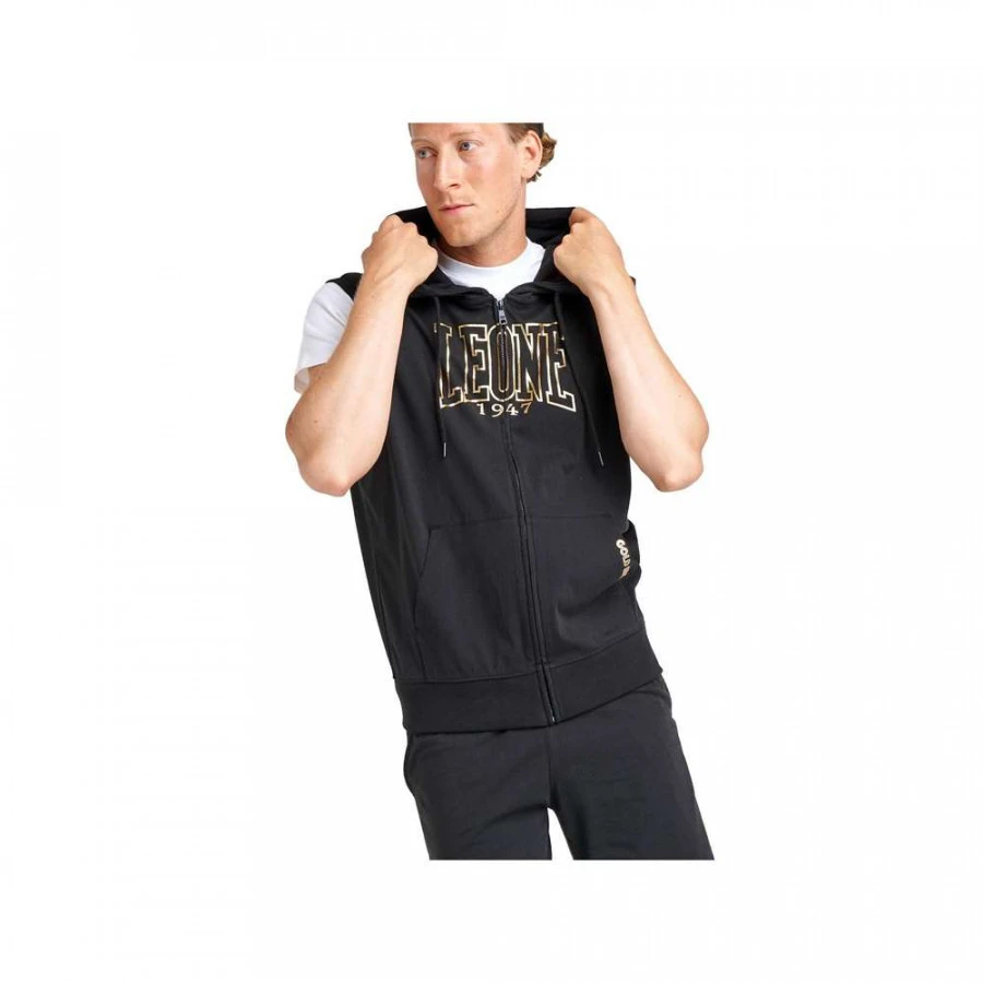 La Felpa smanicata Leone Gold Edition è un capo in heavy jersey, tessuto morbido e comodo perfetto per lo sport e il tempo libero. Dotata di zip, cappuccio e tasche frontali, si distingue per la stampa laminata dorata del logo Leone 1947 sul petto, per un look elegante e casual.