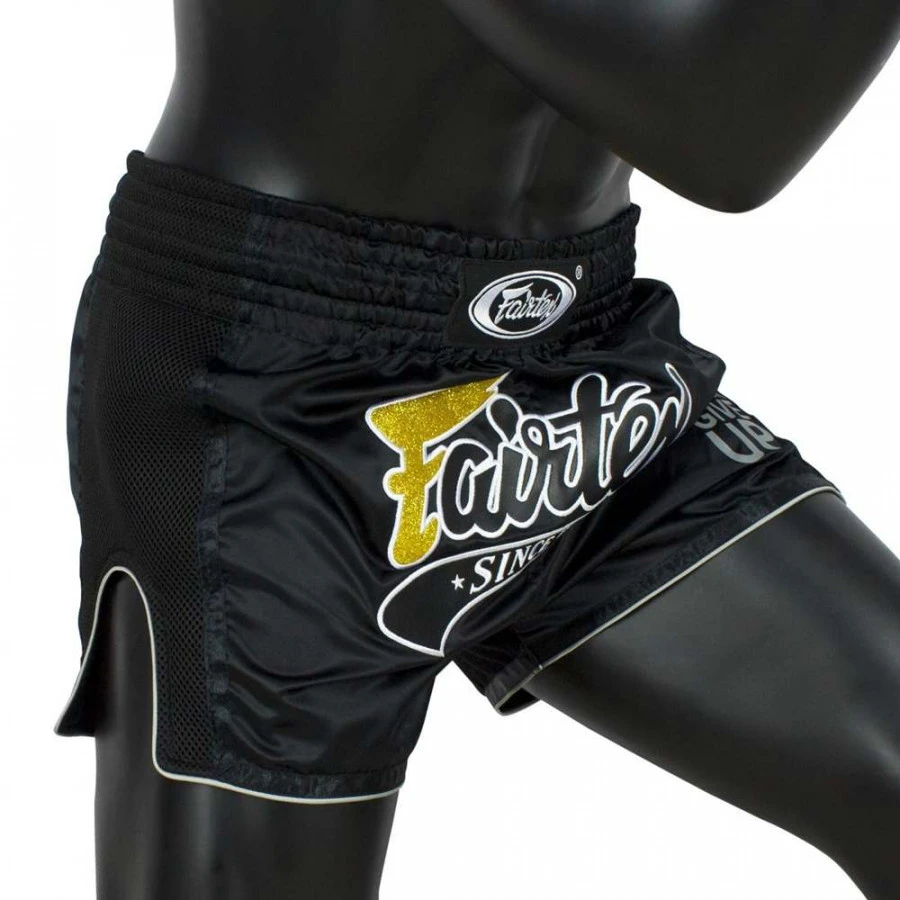 I Pantaloncini Fairtex BS1708 sono degli shorts di manifattura thailandese ideali per la pratica di Muay Thai. Sul raso nero spicca il logo Fairtex, impreziosito dall`iniziale dorata. Sulla gamba sinistra è stampato il motto del brand “Never Give Up” (Non arrendersi mai). Caratterizzati da un nuovo design con fascia elastica più bassa rispetto al design tradizionale, è dotato di sei file di cuciture e spacchetti laterali profondi. Completano il pantaloncino gli inserti laterali in mesh traspirante e il piping che dona maggior resistenza.