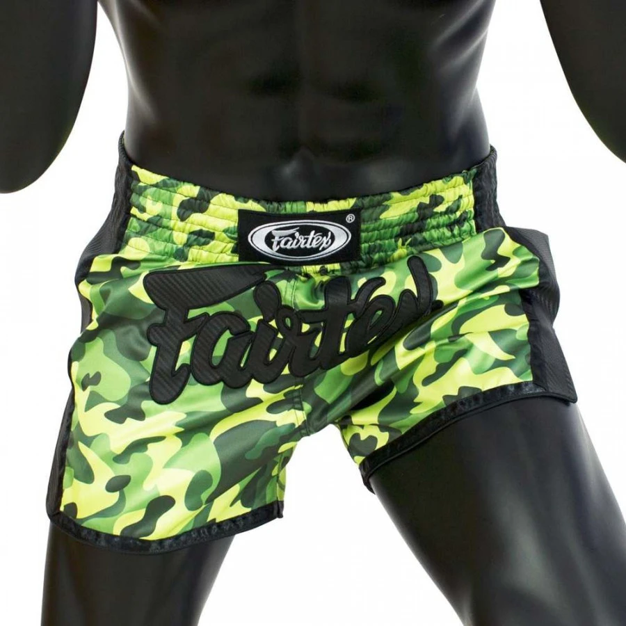 I Pantaloncini Fairtex BS1710 Green Camo sono degli shorts da Muay Thai realizzati in Thailandia. Caratterizzati da nuovo design, hanno taglio slim e spacchetti laterali profondi, che permettono di eseguire in tutta libertà tecniche di calcio e ginocchiate. Resistente e dall`aspetto lucido ed elegante, il satin del pantaloncino si distingue per la fantasia mimetica sui toni del verde. Di colore nero troviamo il logo Fairtex, gli inserti in mesh traspirante e il piping, che dona maggiore resistenza.