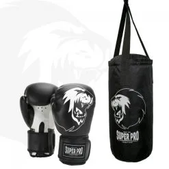 Il Kit bambino Super Pro da allenamento è un set pensato per far avvicinare il tuo bambino allo sport. Ideale per bambini dai 4 agli 8 anni, questo set è composto da sacco da boxe Super Pro e guantoni Super Pro. Rivestito in materiale resistente e riempito con un mix di cotone, il sacco misura 43 cm di altezza per un diametro di 19 cm ed è perfetto per assorbire in maniera ottimale i colpi sia di pugni che di calci. I guantoni sono realizzati in PU, hanno un peso di 6 oz e offrono protezione efficace a mani e nocche.