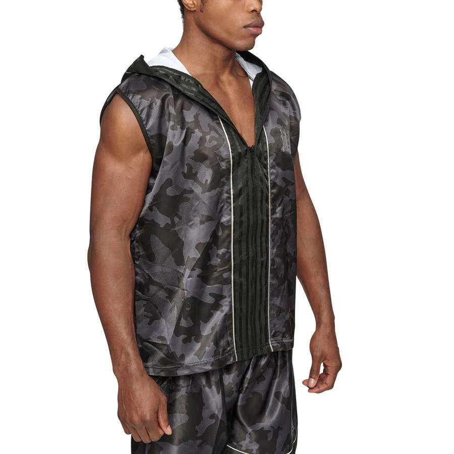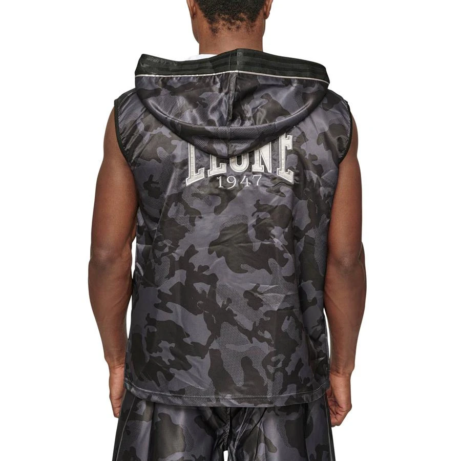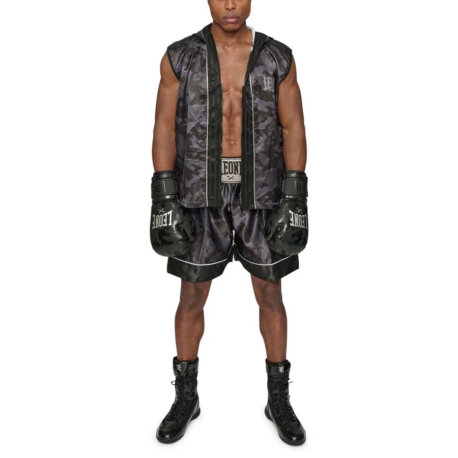 Indossa lo Smanicato da ring Leone CamoBlack AB264 e sali sul ring in modalità Stealth: potente e impenetrabile, indecifrabile e pronto all`attacco. Realizzato in satin e poliestere, questo capo ha un finish lucido che fa risaltare la texture mimetica nera. Dotato di loghi ricamati sul petto e sulla schiena: un dettaglio prezioso ed elegante.