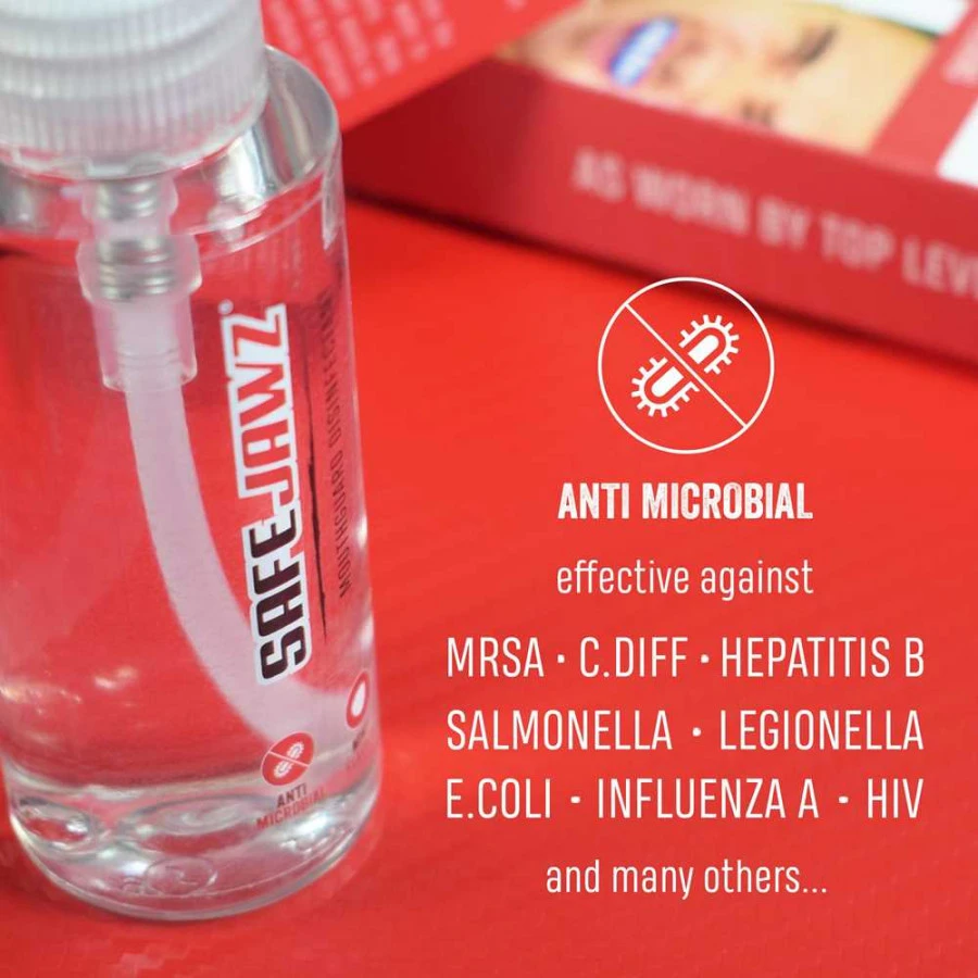 Il paradenti può essere un ricettacolo per germi e batteri. Lo Spray disinfettante SafeJawz per paradenti 50 ml è tutto ciò che ti serve nella lotta contro batteri, virus e funghi. Aromatizzato alla menta, questo spray si è dimostrato efficace contro stafilococco, salmonella, E. coli e molti altri. Grazie alla sua formulazione, uccide il 99,9% dei batteri mantenendo la tua bocca e la tua salute al sicuro. Pratico da usare, è contenuto in un flacone da 50 ml che corrispondono a circa 150 utilizzi. L`efficacia dello Spray disinfettante SafeJawz soddisfa i test standard EN14476 per i virus, EN1276 per i batteri e EN1650 per i funghi.
